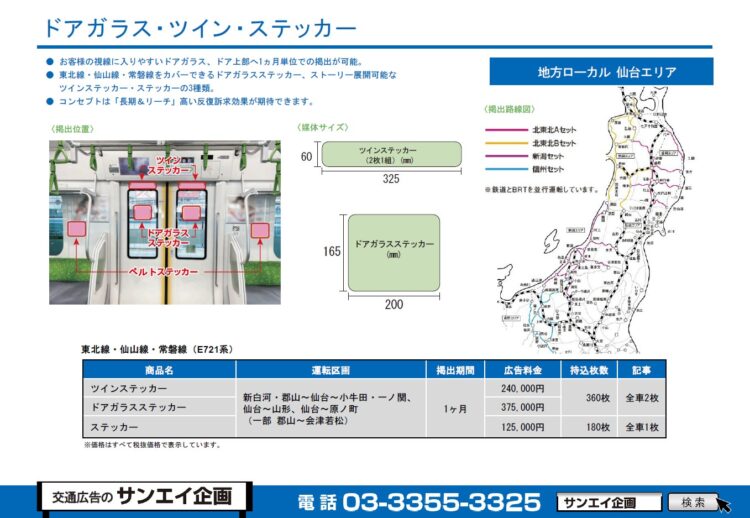 ________________________________________ 資料をお付けします。 ↓をダウンロードしてください。 地方ローカル(仙台エリア)東北線・仙山線・常磐線 料金表(ドアガラス・ツインステッカー)