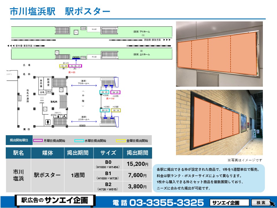 JR市川塩浜駅 駅ポスター掲示場所および料金表