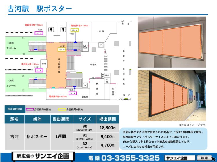 JR古河駅 駅ポスター掲示場所および料金表