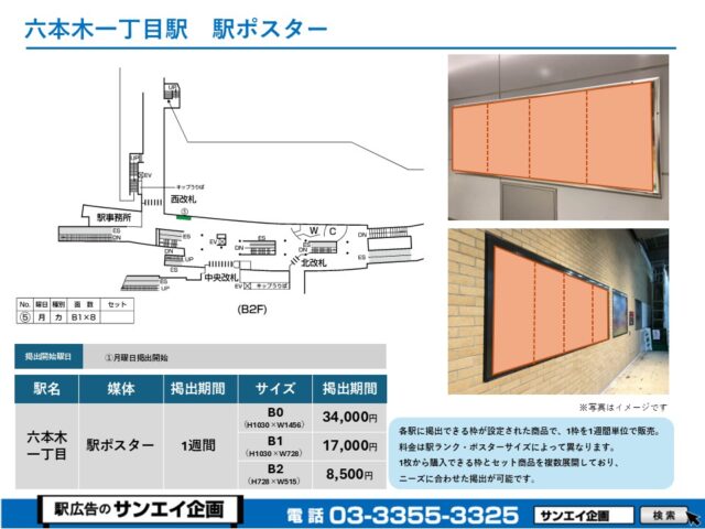 東京メトロ南北線 六本木一丁目駅 駅ポスター掲示場所および料金表