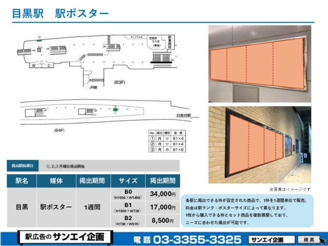 東京メトロ南北線 目黒駅 駅ポスター掲示場所および料金表