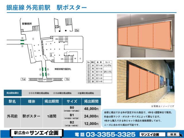 東京メトロ銀座線 外苑前駅 駅ポスター掲示場所および料金表
